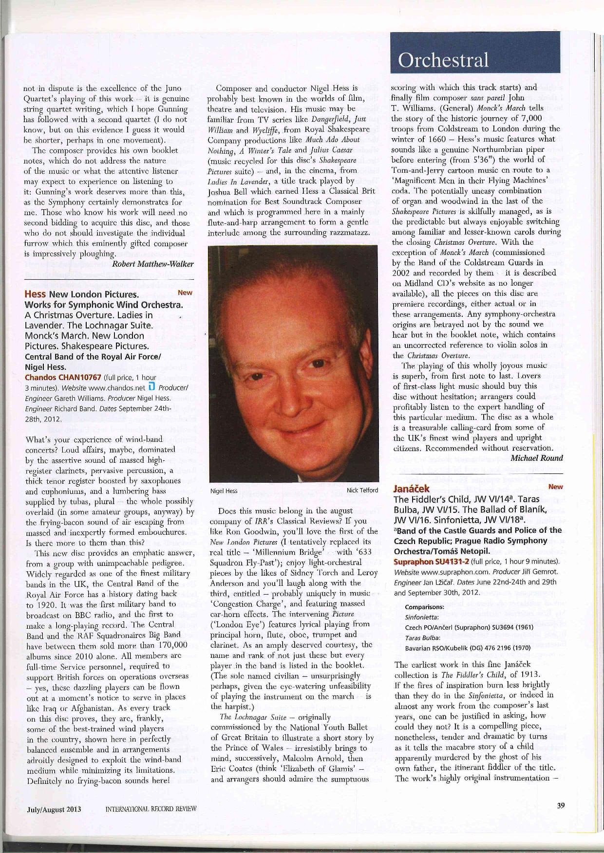 Commissioned by the Coldstream Guards eleven years ago, Monck’s March (the eighth work on the record) brings out Nigel Hess at his picture-painting best – the 7,000 men under General Monck’s command, marching to London from the wintry North; Northumbrian bagpipes, folk-tune laments from the Borders, swashbuckling brass, and catchy, thwacking martial drums set the scene, with the long road south ending at the gates of the City, and a burst of oranges and lemons to show that we have truly arrived.