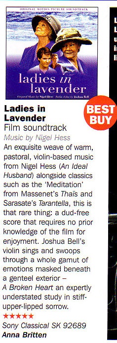 Ladies in Lavender has featured for many consecutive years in Classic FM's Hall of Fame (their top 300 tracks voted for by listeners), and in their 2011 Movie Music Chart the score was voted number 9 in a list of the 101 most popular movie soundtracks.