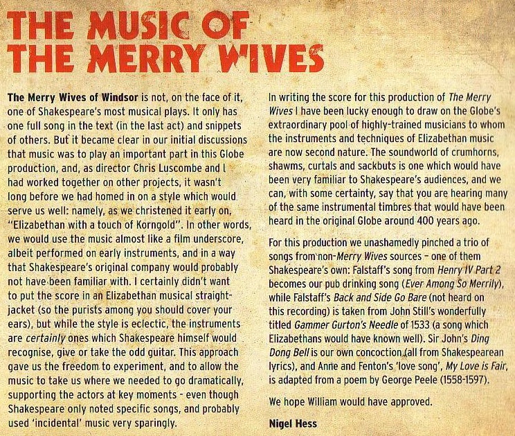 "The small band playing venerable instruments gives an enthusiastic account of Nigel Hess's whimsical music." - Evening Standard"Nigel Hess's merry, delicate musical score....I was touched by the young lovers, Anne and Fenton, singing a roundelay in the pretty garden." - The Times"As with many of the Globe's productions, music plays an important part in this show. Shawms, lutes, curtals, citterns and other strange-sounding musical instruments are employed to provide the accompaniment which assumes something of the role of a film soundtrack. There's also a delightful and charming duet between Anne Page and one of her suitors, Fenton." - London Theatre"What also works is an extensive use of music. Not only is there a delightful duet for the two young lovers and a merry drinking song as well as the fairy roundelays of the final scene, but music leads entrances and supports dialogues and speeches; composer Nigel Hess makes a major contribution to the production's style and atmosphere." - British Theatre Guide"Nigel Hess's delightful score......" - Visit London